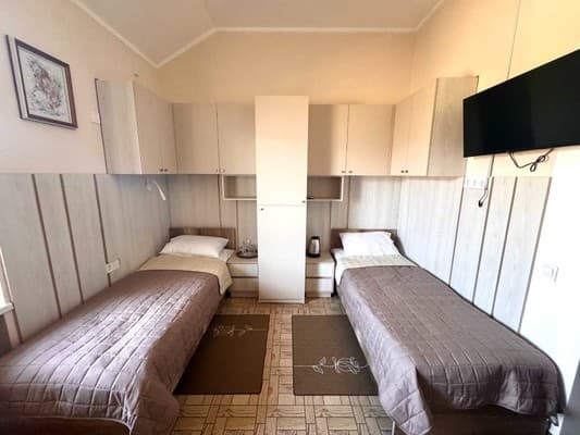 Двохмісний номер з умивальником та обідньою зоною, два односпальні ліжка. В номері є кондиціонер, телевізор, чайник, стіл, стільці, шафа для одягу.Тип спальних місць2x односпальне ліжкоВанна кімнатаСпільна ванна кімната, Спільний туалет, Кімнатні капці, РушникиЗручності у...